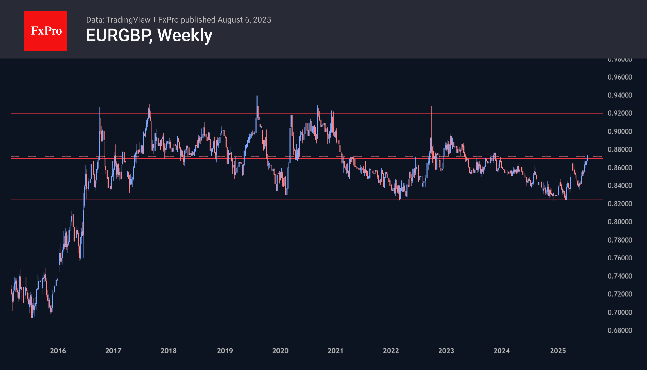 Это может стать моментом прорыва для пары EURGBP. Она подошла к верхней границе торгового диапазона последних двух лет, превысив уровни 0.87. Пробой сопротивления открывает путь в новый диапазон 0.87–0.92, верхняя граница которого работала сопротивлением с 2016 по 2022 годы.