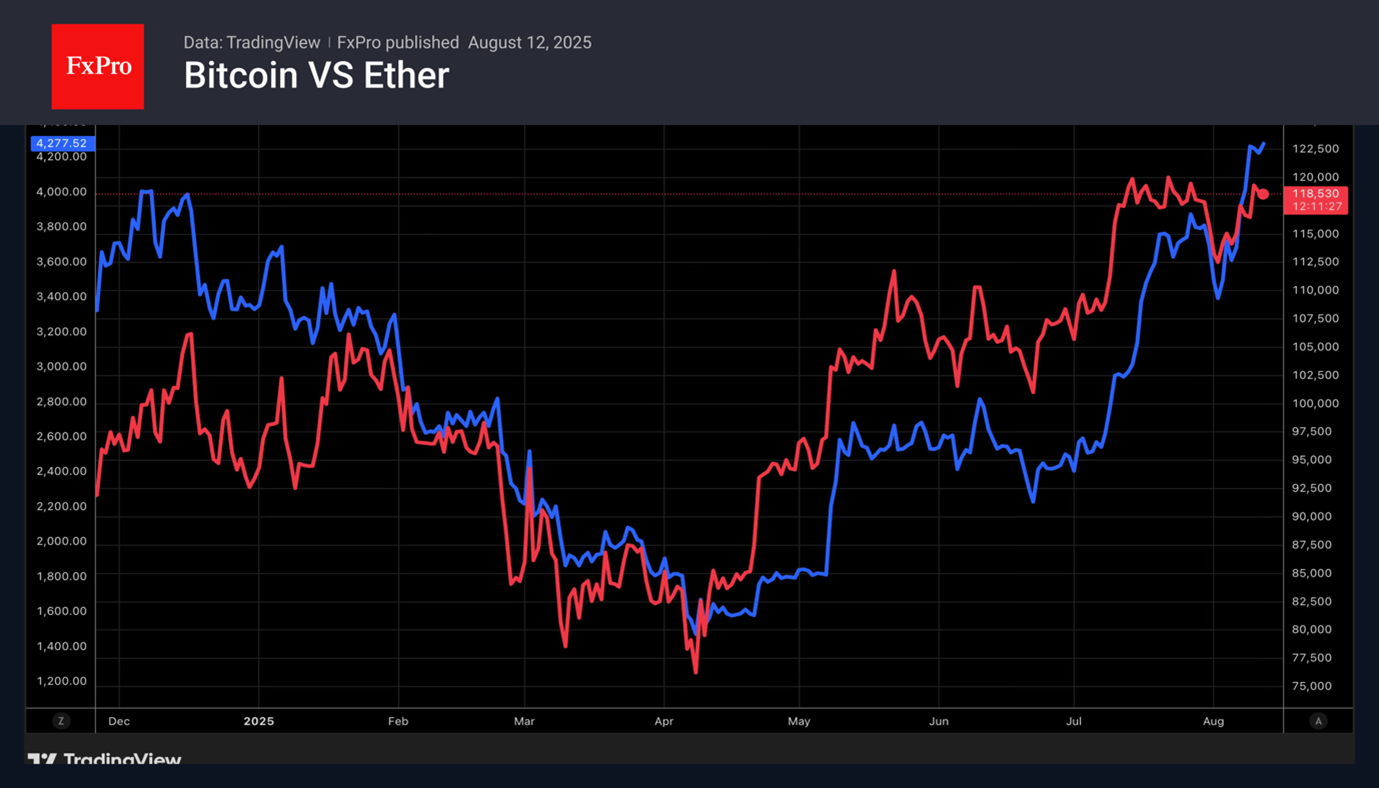 За прошедшую неделю Биткойн подошёл на расстояние вытянутой руки от рекордных максимумов благодаря высокому спросу со стороны институциональных инвесторов и росту глобального аппетита к риску. Не последнюю роль во взлёте BTCUSD сыграл перелив капитала с рынка золота. Однако серьёзную конкуренцию лидеру криптовалют составляет эфир.