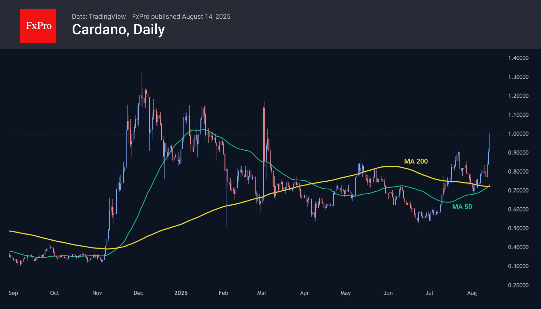 Среди топовых альткоинов за прошедший день выделился Cardano. Его цена превысила $1, чего не было с начала марта, а рост с начала дня – 15%, почти удвоив цену с минимумов в начале июля. Бычий прорыв поддерживается формированием «Золотого креста», когда 50-дневная средняя превышает 200-дневную. Такие технические сигналы очень хорошо отрабатываются на относительно не крупных финансовых инструментах. Потенциальной целью быков теперь выглядит область 1.15 – область сопротивления с начала этого года.