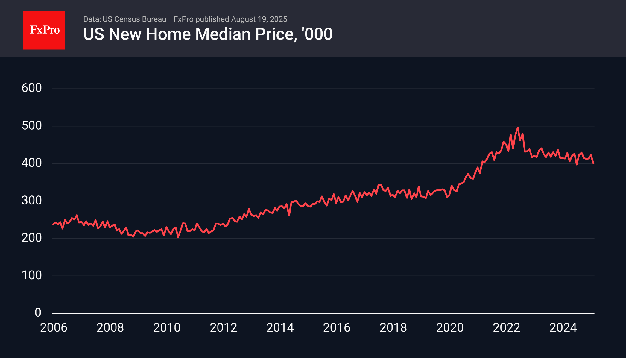 Из отдельных релизов по продажам новостроек также видно давление на цены. Медианная цена проданного нового дома в июне была $401.8 тыс. За исключением провала к $397.6 тыс. в ноябре прошлого года это самое низкое значение за последние четыре года.