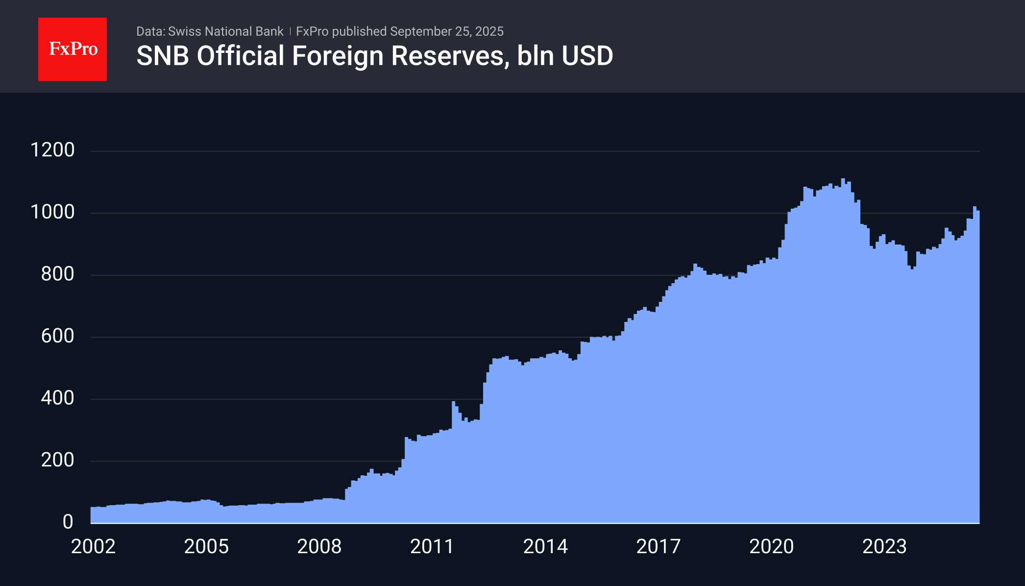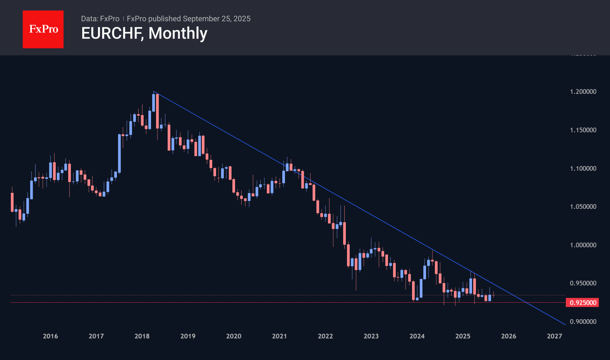 Динамика изменения валютных резервов показывает, что НБШ продаёт франк и покупает валюту с конца 2023 года. Всё это время EURCHF не опускается ниже 0.9200. При этом с 2021 года в паре формируется последовательность более низких локальных максимумов, указывающая на нарастающее давление покупателей франка. Эта линия сопротивления теперь находится вблизи 0.95, против 0.9650 в начале года, 0.9950 в мае 2024 и 1.11 в начале 2021.