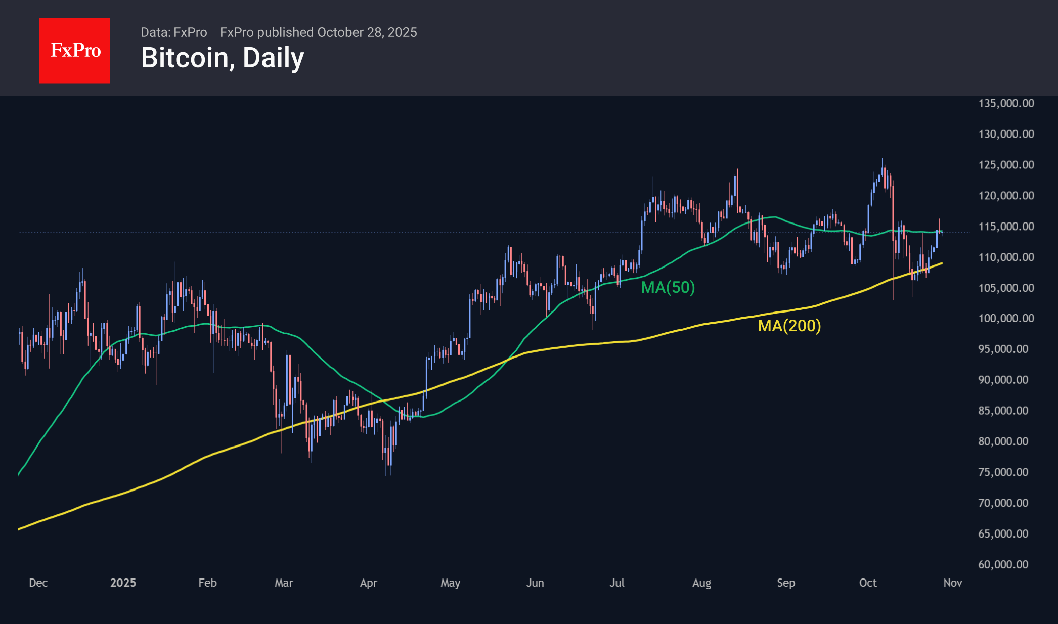 Биткоин откатился к $114K, оставаясь прилепленным к 50-дневной скользящей средней. На старте недели была попытка выйти вверх из диапазона, очерченного 50- и 200-дневными скользящими средними. Откат цены в конце дня в понедельник не позволят утверждать победу быков. Если Биткоин сейчас действительно в настроении быть цифровым золотом, это плохие новости для покупателей.