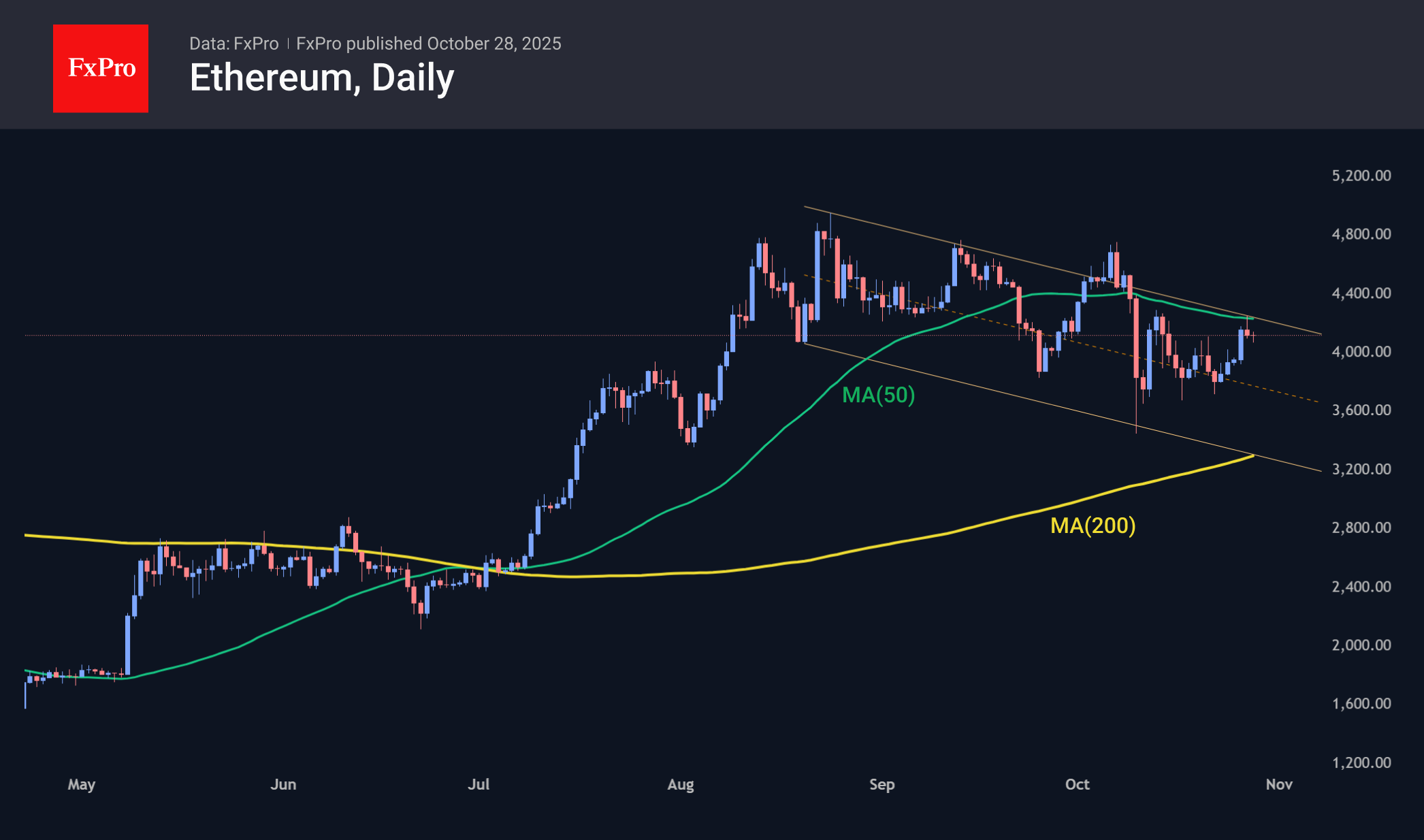 Ethereum торгуется вблизи $4100. Попытки прорваться выше 4200 и преодолеть сопротивление в виде 50-дневной средней в понедельник не увенчались успехом. Пока ETHUSD с августа рисует нисходящую тенденцию с чередой более низких локальных минимумов и максимумов. Говорить о сломе этой тенденции можно будет лишь после закрепления над $4300.