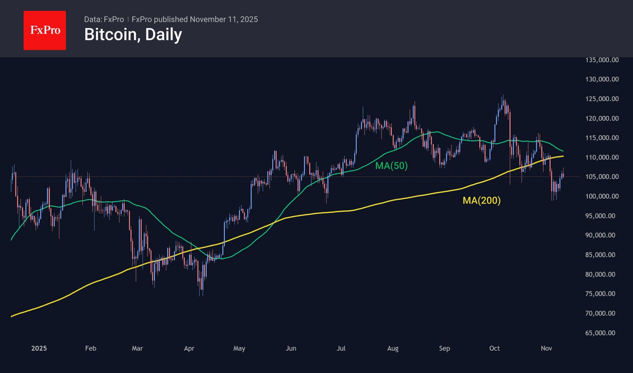 Капитализация крипторынка откатилась на 1.1%, остывая после впечатляющего рывка в первой половине дня в понедельник. Техническим сопротивлением выступила 50-дневная скользящая средняя вблизи $3.62 трлн., а восхождение рынка застопорилось у $3.6 трлн. Невзирая на впечатляющий рывок в понедельник, вполне возможно, что на рынке формируется новый, более низкий локальный максимум, развивая нисходящую тенденцию, запущенную чуть более месяца назад.