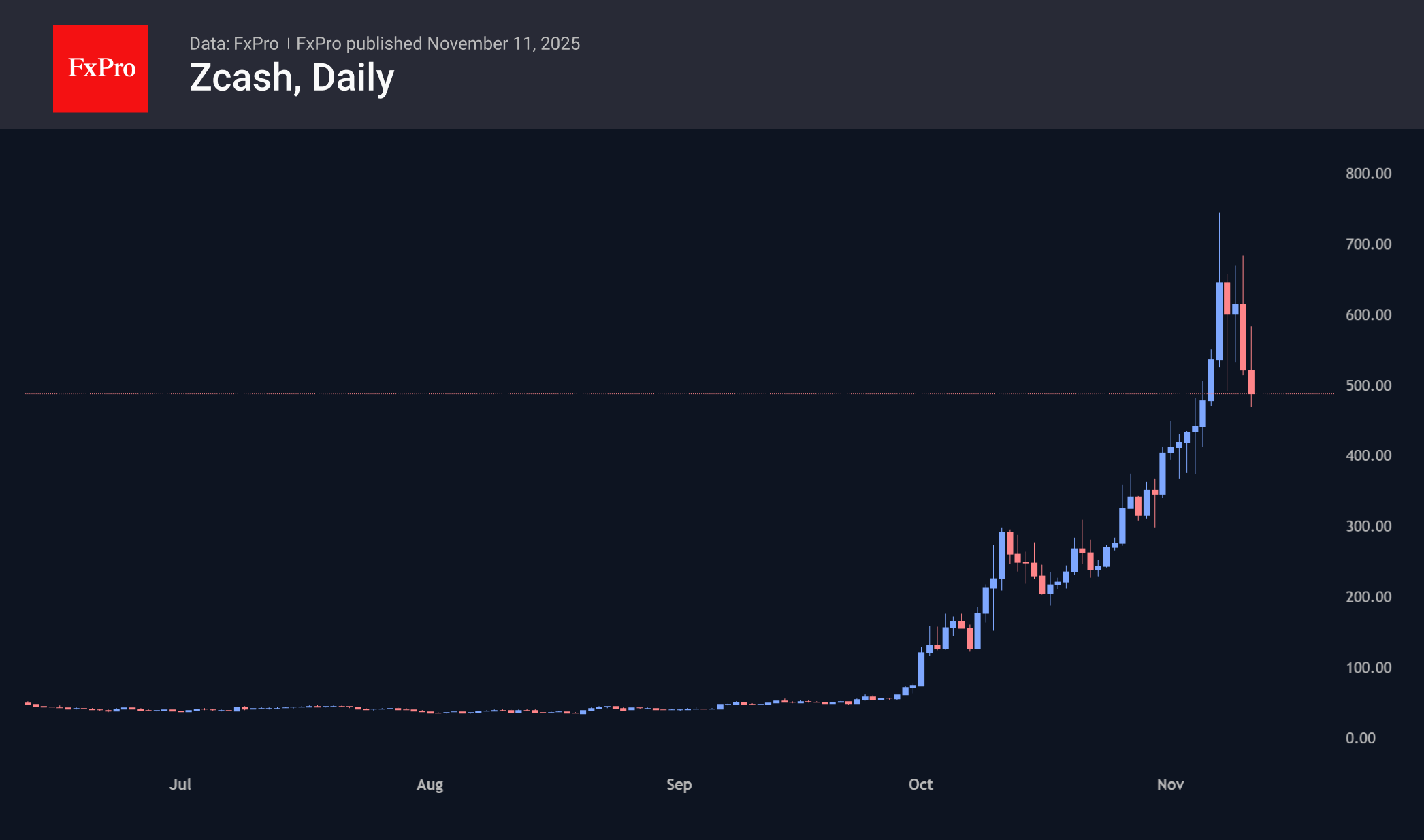 Zcash откатился до $477, потеряв почти 40% от пика в конце прошлой недели. Текущее развитие событий, продолжает питать наши страхи, что мы видим не более чем повторение динамики прошлых лет, когда резкое ускорение альткоинов, и ZEC в частности, происходило, когда рынок уже в целом был надломлен.