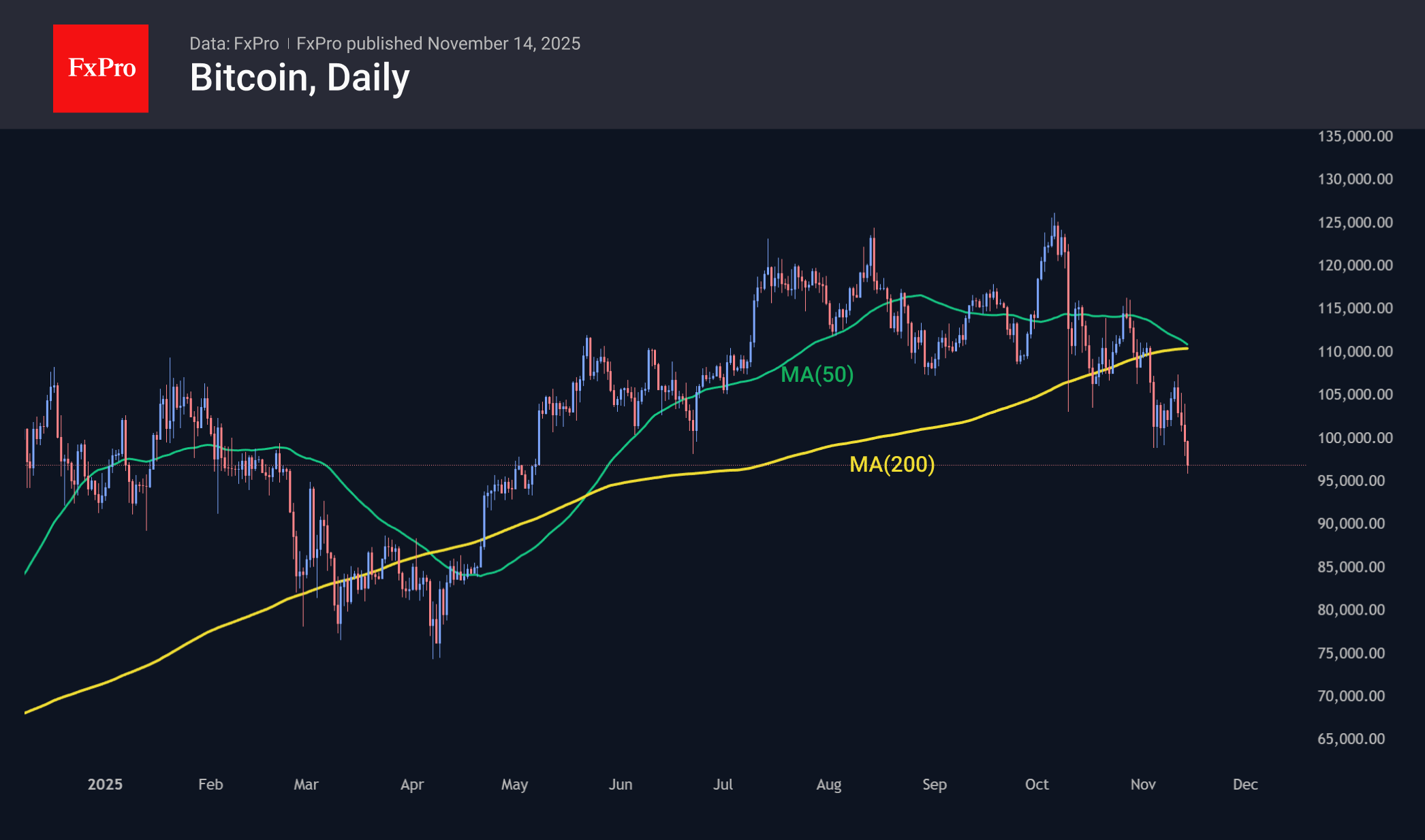 Биткоин опустился ниже $97K теряя почти 6% за последние 24 часа. Находясь под непрерывным давлением с 11 ноября, BTC потерял уже свыше 11%, откатившись до уровней, которые мы в последний раз наблюдали в мае. Медвежий сигнал – крест смерти – уже вплотную нависает над первой криптовалютой. Этот сигнал работает на классических рынках, но в последние разы вместо падения за этим сигналом следовал рост, так как предыдущая сильная распродажа истощалась. Верно и обратное: золотой крест приходился на период вблизи локального пика.