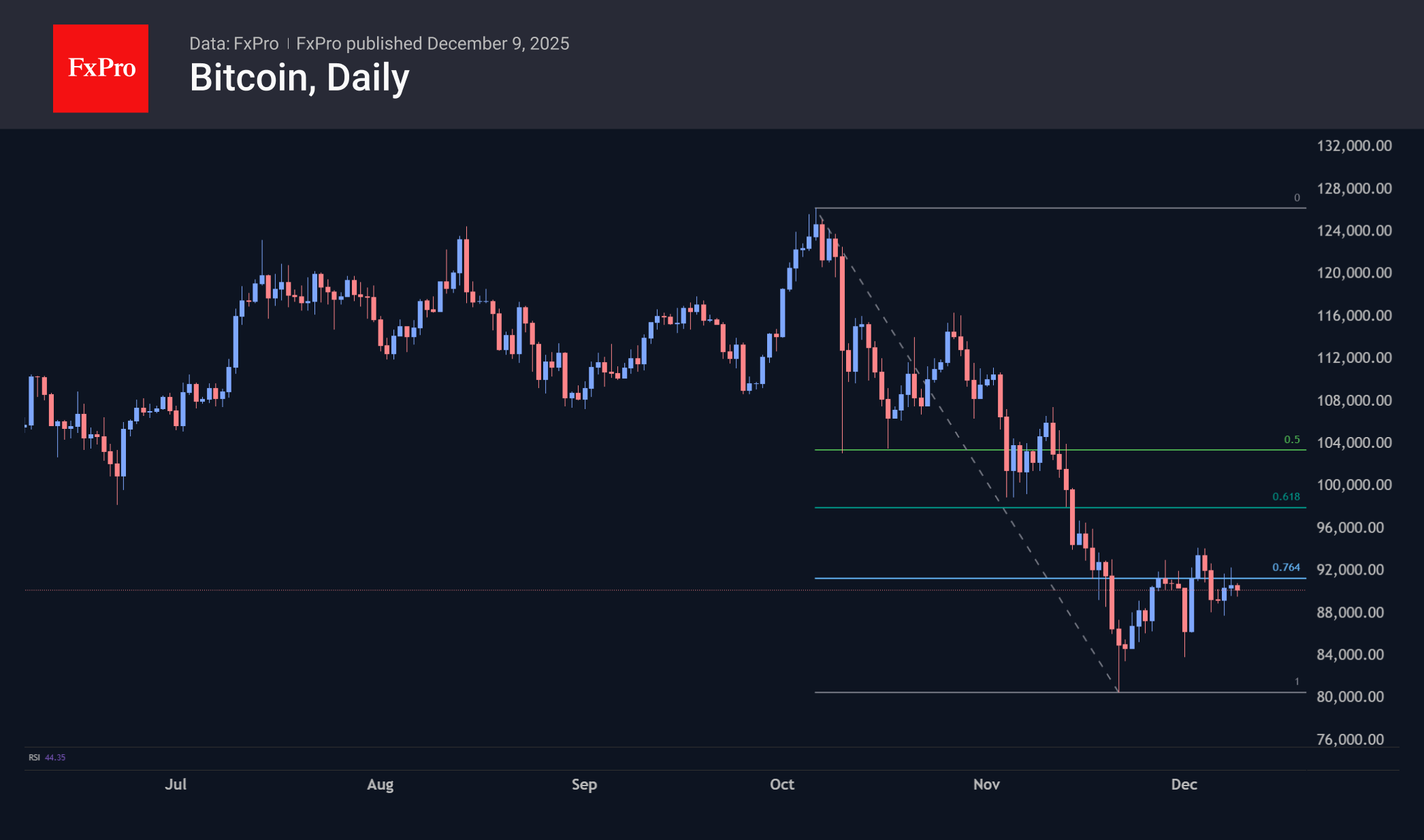 Биткоин курсирует вблизи $90K, пересекая эту линию пятый день подряд. Через минимумы конца ноября можно провести повышательную линию тенденции, но сейчас BTC курсирует опасно близко к этой линии. При этом сформировано горизонтальное сопротивление в области $92K, сближая позиции быков и медведей со временем и обещая решающую битву до конца этой недели. Она может стать не только последней важной битвой года, но и определить тенденцию последующих месяцев.