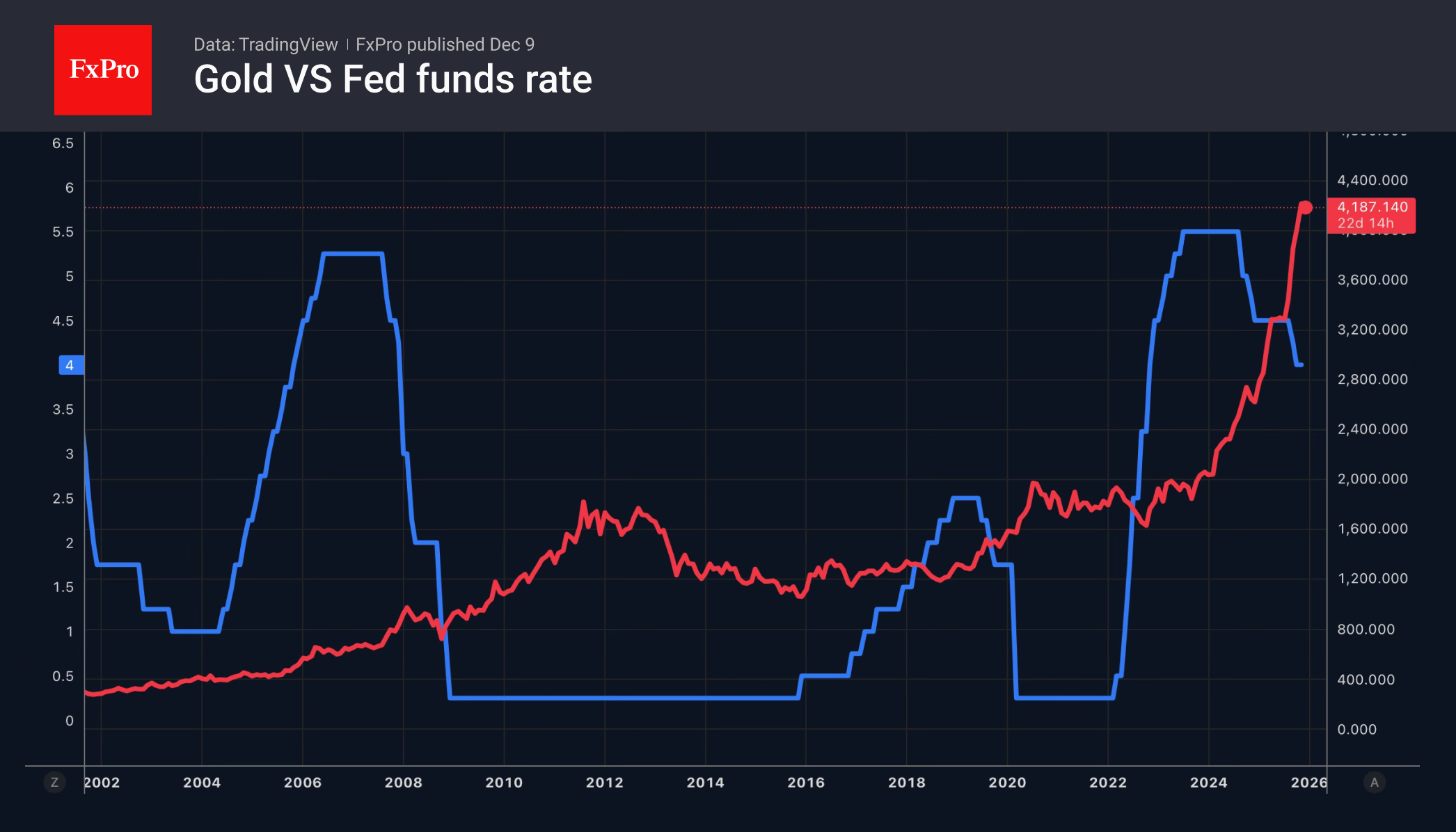 Поддержку золоту оказывает высокий спрос со стороны поклонников ETF, в первую очередь, в Китае и Индии. По данным Всемирного золотого совета, запасы ориентированных на драгметалл специализированных биржевых фондов достигли отметки 3932 т в конце ноября, прибавляя каждый месяц кроме мая и суммарно нарастив запасы на более чем 700 т за 2025. Это рекорд как в стоимостном, так и в физическом выражении.