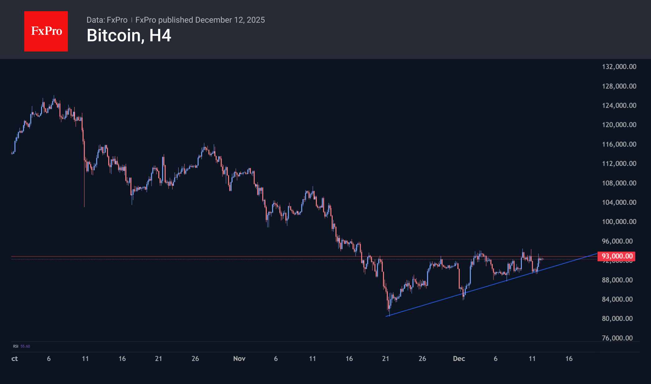 Биткоин продолжает получать поддержку на спадах, но, как и весь рынок, упирается в горизонтальное сопротивление. Такая динамика наводит на мысль, что с конца ноября идёт отскок на медвежьем рынке, за которым вскоре последует новый импульс снижения.