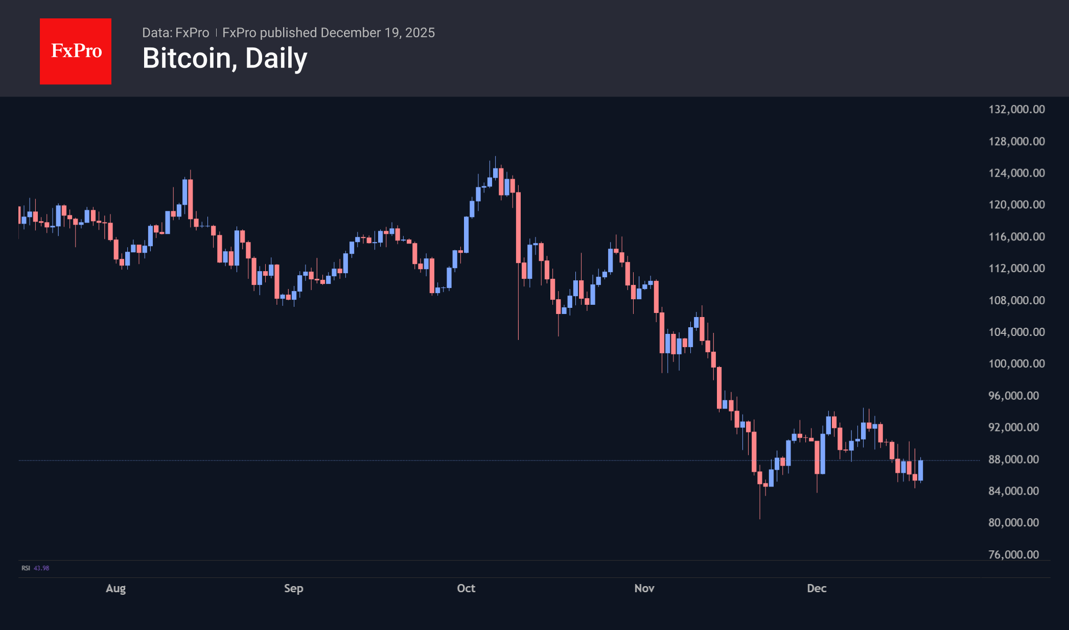 Биткоин в четверг заново играл микро-драму среды, взлетая по направлению к $90K, но лишь для того, чтобы вскоре обрушиться ниже предыдущих локальных минимумов. В результате, по итогам дня внутридневной минимум откатился до $84K, что мы в последний раз видели почти пять недель назад. Однако в пятницу утром цена вновь у уровня $87K, вокруг которого она курсирует последние четыре дня.