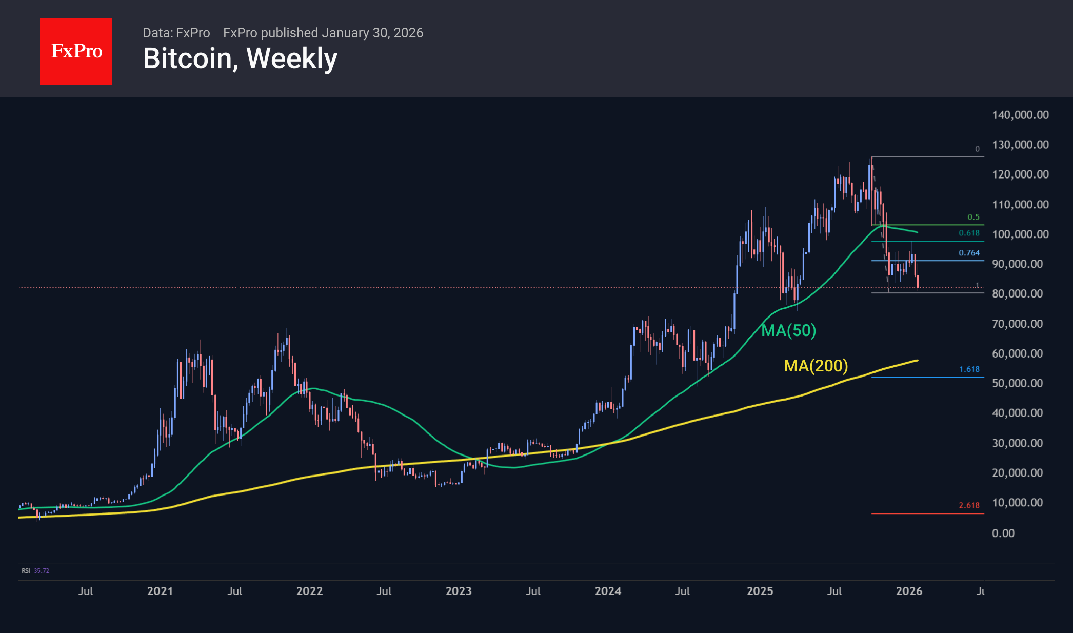 Капитализация крипторынка рухнула примерно на 5% до $2.82T, а в своей нижней точке дважды опускалась до $2.78T – минимума с апреля прошлого года. Импульс снижения рынков сырья и акций, как мы и предполагали, лишь усилил давление на криптовалютный рынок, а распродажи проходили на повышенных объёмах, так как за время длительной консолидации участники рынка подтянули ближе стоп-ордера. Наш худший сценарий предполагает снижение в область $1.8-2.0T при расширении до 161.8% от изначального импульса снижения в октябре-ноябре.