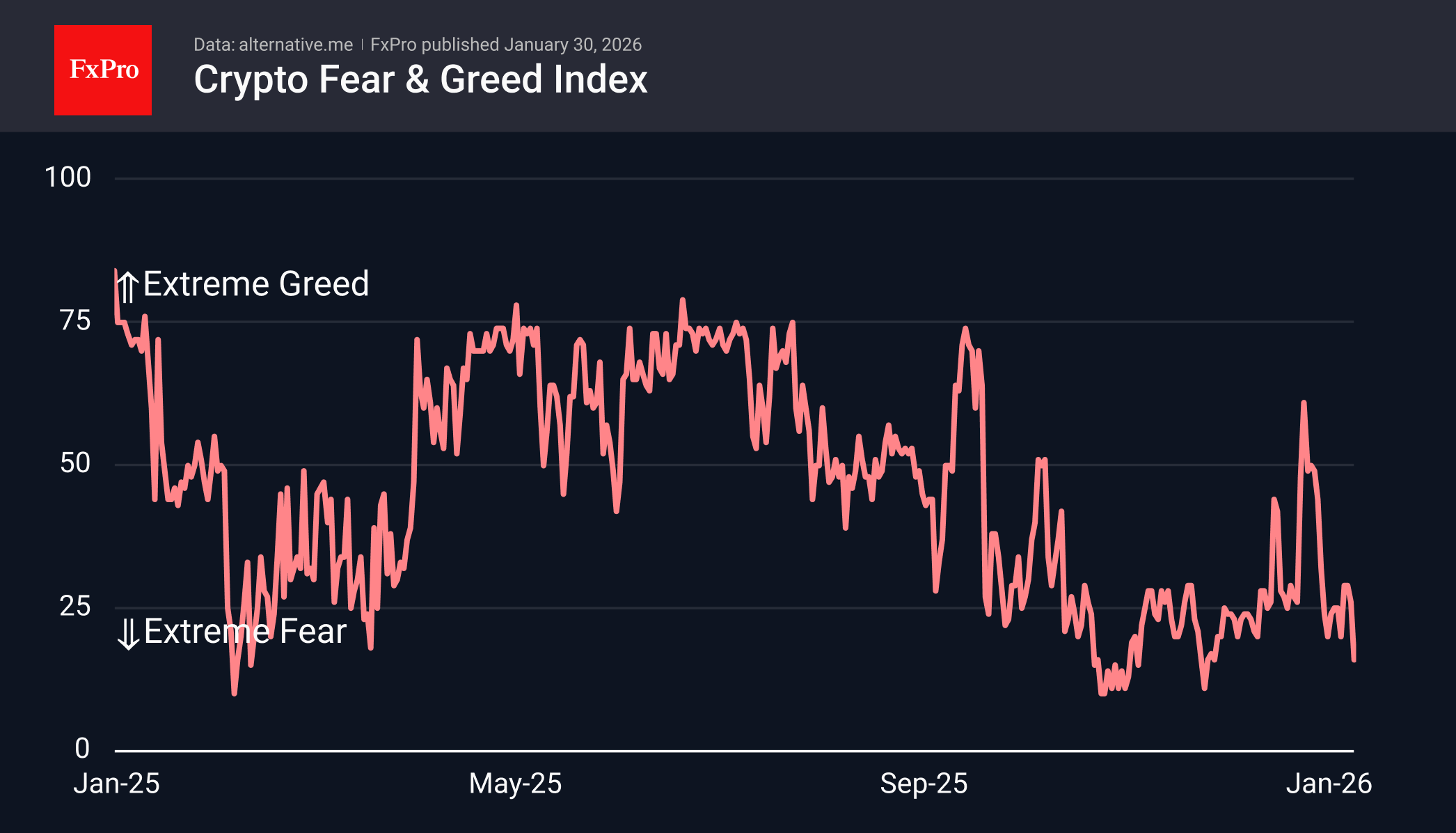 Индекс настроений провалился к пятнице до 16. Это минимум за последние шесть недель и возвращение на территорию экстремального страха, выбраться из которого удавалось лишь на два дня в течение этой недели. Мы не устаём напоминать, что хотя такие значения настроений воспринимаются как возможность для покупки, всё же более осторожный подход предполагает покупки при выходе из территории экстремального страха, чтобы избежать рисков резких проскальзываний вниз.