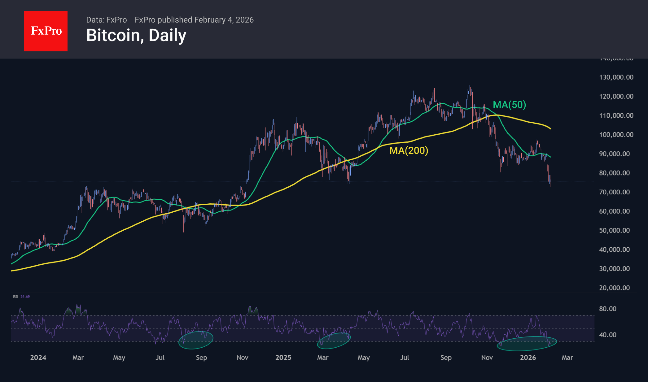 Биткоин во вторник пробил минимумы 2025 года и краткосрочно падал ниже $73 000, к минимумам начала ноября 2024 года. Хотя с началом дня в среду наметился некоторый отскок, сформированная последовательность более низких локальных максимумов и минимумов указывает, что на рынках преобладают продажи на росте. Быки, со своей стороны, могут указывать на перепроданность по RSI и дивергенцию, когда более низкому локальному минимуму цены соответствует более высокий локальный минимум индекса относительной силы. В 2024 и 2025 годах были два подобных случая с последующим ростом на более 20% и 60%, соответственно. Однако, во время медвежьего рынка 2020 года подобные сигналы не работали.