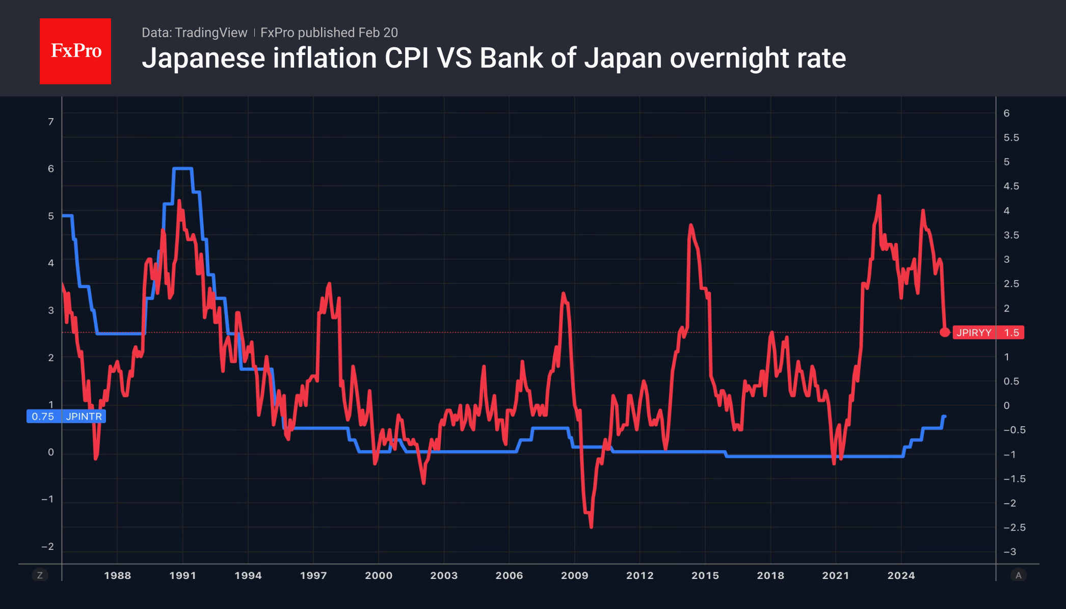 Падение потребительских цен в Японии до 1.5%, минимальной отметки с марта 2022, поддержало рост USDJPY. Замедление инфляции позволяет центробанку не торопиться с повышением ставок. Одновременно это развязывает руки Санаэ Такаити по расширению фискальных стимулов. Премьер-министр намерена выступить перед парламентом и изложить свою экономическую политику. Инвесторы опасаются, что чрезмерные стимулы возродят Такаити-трейд, утопив иену.