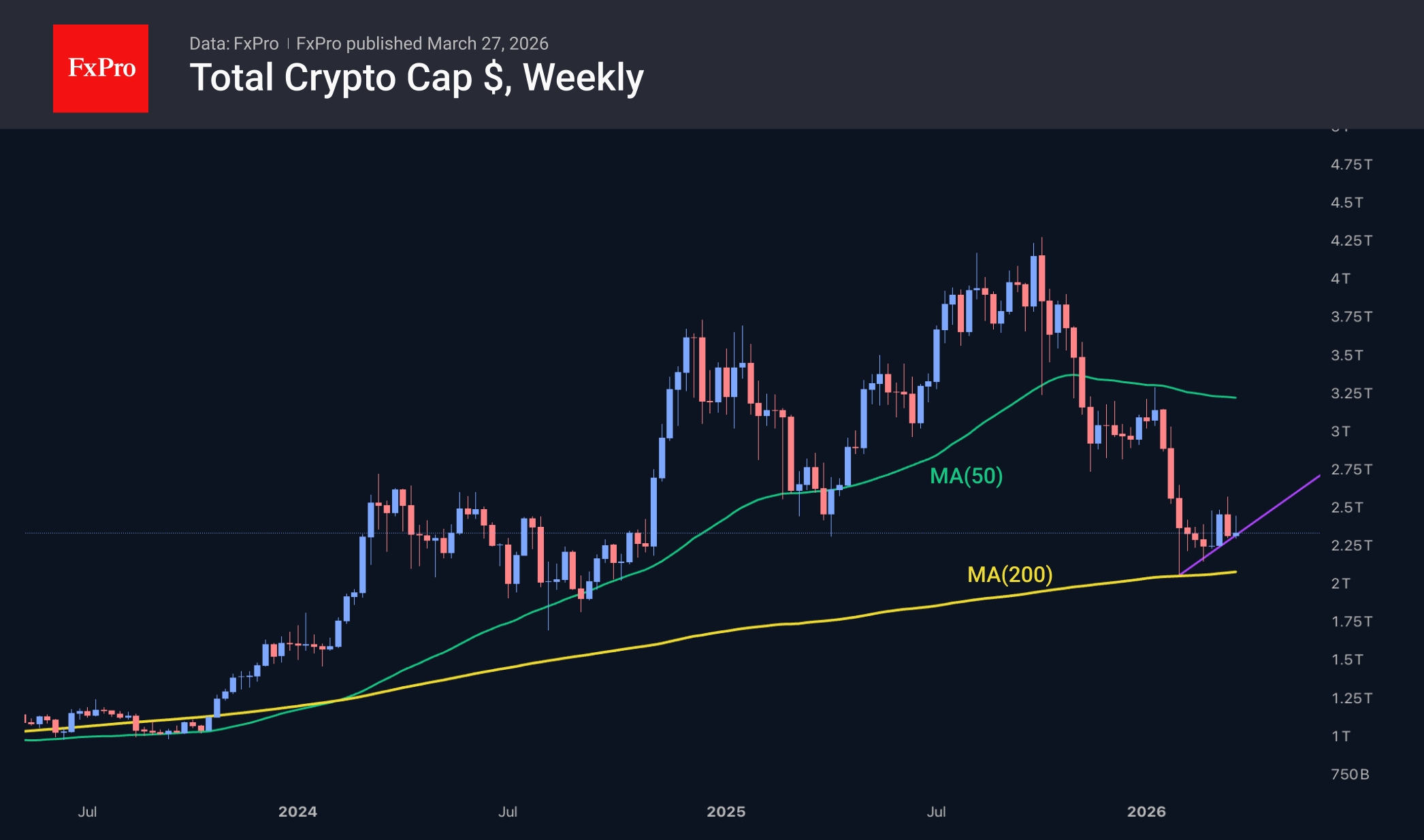 Капитализация крипторынка сократилась на 3.4% за 24 часа до $2.36T, оставаясь вблизи линии повышательного тренда. Импульс снижения вновь давали фондовые индексы, вернувшиеся на минимумы на старте недели. Однако пока в Nasdaq100 устойчивая тенденция снижения на недельных графиках с конца января, криптовалюты формируют последовательность более высоких локальных минимумов с начала февраля, когда рынок коснулся 200-недельной скользящей средней – важнейшей линии долгосрочной тенденции.