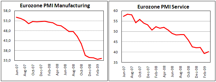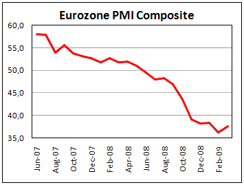 Индекс PMI зоны евро вырос в марте до 37,6, что стало неожиданностью для экономистов. Средний рыночный прогноз предполагал, что индикатор не изменится, оставшись на уровне 36,2. Основной вклад в улучшение внесла сфера услуг. Соответствующий индекс прибавил 0,9 базисного пункта, составив 40,1. Более сильная динамика отмечается также и в производственных отраслях, хотя текущее улучшение является не более чем замедлением темпов падения. Германский PMI также частично отыграл предшествующее снижение. Но в то же время внимание участников торгов привлек прогноз Commerzbank, в котором говорится, что ВВП Германии может сократиться на 6-7% в течение 2009 года и эта страна будет одной из наиболее пострадавших в ходе текущего экономического кризиса. Положительные факторы для единой валюты, такие как идея создания в США «плохого банка», уравновешивается довольно слабыми реальными показателями производства и потребительской активности. Евро/доллар на этом консолидируется в коридоре 1,35-1,3750 уже второй день. Для продолжения роста пары нужны положительные сигналы со стороны еврозоны, говорящие о том, что экономика не только прекратила снижение, но также начала постепенно восстанавливаться. Пока их нет, над евро нарастает риск снижения в свете ожиданий смягчения монетарной политики, а также предположений, что наибольшие трудности уже прошли для США, но еще только предстоят еврозоне.