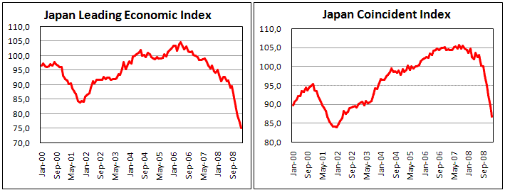 Индекс опережающих индикаторов Японии продолжил нисходящее движение по итогам февраля, отражая ухудшающуюся обстановку в стране. Показатель опустился до 75,2 с 77,2 месяцем ранее. Совпадающие индикаторы также направились вниз, но этот индекс пока еще далек от тестирования глобальных минимумов. Это означает, что ситуация может в ближайшие месяцы продолжать ухудшаться на фоне падения спроса на японские товары, сократившие экспорт вполовину. Тем не менее, вопросы о дальнейшей динамике производства могут быть не столь острыми, так как японская валюта достигла минимального уровня за последние пять месяцев. На прошлой неделе была преодолена важная отметка в 100 иен за доллар на фоне роста склонности инвесторов к фондированию в иенах. Японская валюта заметно выросла в течении 2008 года на фоне крайне слабой макроэкономической статистики, что увеличивает вероятность разворота тенденции. При этом стоимость заимствования в иенах очень невысока, к тому же появилось и направление, куда вкладывать деньги: акции и облигации были очень сильно перепроданы. Когда рынки увидели, что самый негативный сценарий не осуществляется, капиталы из долларов, иен и золота потекли в более доходные активы. Этот процесс, по крайней мере для usd и jpy, выглядит только начавшимся.