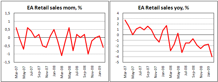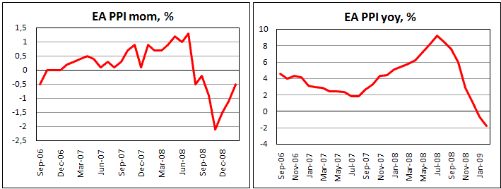 Розничные продажи в Еврозоне упали в феврале на 0,6% после роста на 0,1% месяцем ранее. Данные оказались заметно хуже прогнозов, вызвав опасения, что потребительский спрос может быть слабей, чем это оценивалось ранее. Спад продаж по сравнению с февралем прошлого года составил 4,0%. При этом прогнозировалось падение лишь на 2,5%. Также сегодня были опубликованы показатели производственной инфляции. Индекс PPI снизился на 0,5% за месяц. А по сравнению с уровнем предшествующего года показатель упал на 1,8%. Наибольший вклад в ослабление инфляции по итогам года внесли энергетика, а в дальнейшем разрыв по итогам года будет только нарастать, так как в 2008 с весны началось ралли энергоносителей, обеспечивая высокую базу для сравнения. Обе эти новости являются довольно слабыми для единой валюты, так как заставляют ЕЦБ действовать более агрессивно в смягчении денежно-кредитной политики. На прошлой неделе Трише и компания продемонстрировали крайнее нежелание быстро приближаться к количественному ослаблению, снизив процентную ставку лишь на 0,25% против ожиданий сокращения на половину процентного пункта. С начала европейской сессии единая валюта находится под давлением, так как трейдеры закладываются на слабую динамику и в дальнейшем, а также на более решительные шаги от Европейского ЦБ по смягчению условий кредитования. Все это будет и в дальнейшем оказывать давление на евро.