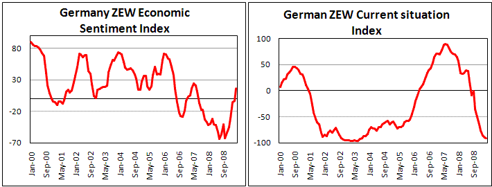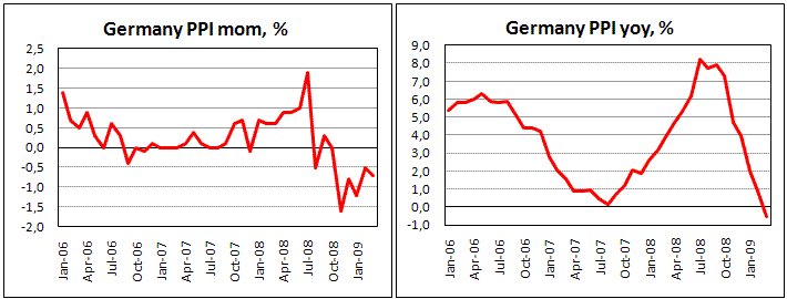 Цены производителей в Германии опустились по итогам марта на 0,7%. Цены уже в течение полугода демонстрируют отсутствие положительной динамики. По отношению к марту 2008 года индекс PPI опустился на 0,5%, в то время как еще месяц назад прирастал на 0,9%. Особо нужно отметить, что слабые показатели цен производителей мы получаем на фоне относительно стабильных котировок энергоносителей. Фактические показатели цен производителей оказались заметно ниже прогнозов, что оказало в начале дня давление на единую валюту, однако, опубликованный позднее индикатор Настроений в деловых кругах Германии заметно превысил ожидания. Индекс вырос до 13,0 с -3,5 месяцем ранее. Это очень резкий рост, обусловленный в основном ожиданиями от правительственных пакетов помощи. Кроме того, многие отмечают улучшение в прогнозах относительно восстановления США, а также с оптимизмом отмечают признаки улучшения в Китае. В то же время текущая оценка продолжает снижаться. Тех, кто считает текущие условия хорошими, не осталось вовсе. Зато пессимистов 91,6%, остальные сохраняют нейтралитет. Мы по-прежнему скептически относимся к восстановлению настроений в деловых кругах на фоне роста безработицы и падении производственной активности. До настоящего момента дальше ожиданий мы фактически не сдвинулись. Так что в течение этой недели мы ждем дальнейшего снижения eur/usd с целью на 1,27.