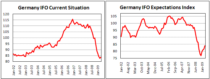 Индекс настроений в деловых кругах Германии вырос заметно сильнее, чем это прогнозировали экономисты. Показатель бизнес-климата прибавил 1,5 пункта, увеличившись до 83,7. Ожидания продолжили четырехмесячный восходящий тренд, что не вызывает удивления на фоне масштабных программ стимулирования экономики, а также смягчение монетарной политики, которое проводит и ожидается в дальнейшем от ЕЦБ. Удивление вызывает та скорость, с которой показатель растет, опираясь также на последние довольно оптимистичные прогнозы, где отмечается стабилизация спада экономики: это уже не свободное падение. При этом полностью игнорируются печальные прогнозы от Германских институтов и Международного Валютного Фонда, так как они могут не учитывать последней информации, где широко отмечаются показатели «лучше ожиданий». Господствующей темой становятся сообщения о том, что дно уже осталось позади, и в ближайшие месяцы предстоит постепенное улучшение показателей. Дополнительным драйвером сегодня утром стало сообщение о том, что потребительские расходы во Франции выросли в марте на 1,1%, заметно превысив прогнозы. Причинами стали низкие показатели инфляции и программы стимулов от правительства, повышающие интерес к покупкам. Единая валюта сегодня может стать бенефициаром, подкрепленная хорошими новостями сегодня в ходе торгов и неплохими показателями вчера. Ее курс уже превысил 1,32, а к концу следующей недели рискует достигнуть отметки в 1,37 после очередного заседания Федерального Резерва и публикации данных по ВВП США в первом квартале.