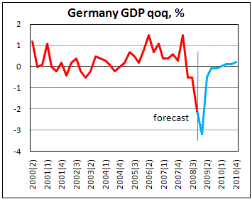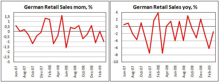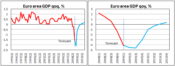 Начало торгов на этой неделе прошло под положительным влиянием азиатской сессии и неплохих новостей с сырьевых площадок мира. Участники торгов по-прежнему усматривают любые положительные сигналы, чтобы купить сильно подешевевшие на медвежьем рынке активы. Тем не менее, несмотря на оживление, фундаментальные показатели в Европе остаются весьма слабыми, не обещая легкого и быстрого преодоления снижения экономики. Так розничные продажи в Германии упал в марте на 1,0% к апрелю, против ожиданий, что показатель сохранится на прежнем уровне. Опубликованные данные продаж автомобилей по всему миру свидетельствуют о продолжающемся падении спроса. За год продажи на этом рынке упали на треть по всему миру в основном после слухов о проблемах GM и Chrysler, хотя первую половину апреля наблюдалась некоторая стабилизация этого рынка. Тем не менее, уровень продаж продолжает оставаться под давлением, несколько отодвигая прогнозы о скором начале восстановления экономики. Подлила масло в огонь и Европейская комиссия. Они ухудшили свой прогноз ВВП Германии до -5,2% в текущем году и +0,3% в предстоящем, более позитивно оценив перспективы по сравнению с германскими институтами, министерством финансов и Международным Валютным фондом. Особо указав Венгрию, где госдолг может вырасти до 81% от ВВП и Испанию, в которой ожидается увеличение уровня безработицы до 20% к 2010 году. В целом же пересмотрены показатели роста для всей еврозоны. Теперь ожидается сокращение ВВП на 4,0% в 2009 году и на 0,1% в 2010. Безработица с текущего уровня в 8,7% достигнет к концу года 9,9%, а к следующему составит 11,5%. На двузначную величину ожидается сокращение ВВП стран Балтии, а наиболее резко, согласно прогнозам, сократится экономика Латвии. Экономика Еврозоны находится в состоянии рецессии с середины 2008 года, американская – его начала. Такой же разрыв в два-три квартала скорее всего сохранится и на время выхода экономики из состояния спада. Согласно прогнозам Еврокомиссии, худшие показатели год-к-году будут достигнуты в третьем квартале 2009 года, а до этого времени ЕЦБ и правительствам многих стран предстоит проделать кропотливую работу по поддержанию экономики, что будет отражаться на единой валюте. В частности, ожидаемое на этой неделе решение Европейского Центробанка по монетарной политике все же может порадовать нас конкретикой в отношении нестандартных мер, на фоне серьезно ухудшившегося экономического прогноза и резкого замедления темпов инфляции.