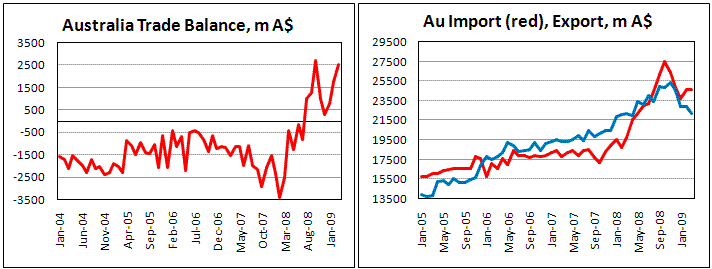 Рост розничных продаж в Австралии в марте оказался заметно лучше прогнозов, показав рост на 2,2% вслед за двухпроцентным снижением месяцем ранее. В среднем экономисты предсказывали рост всего на 0,5%. Годовой темп роста торговли вырос до 6,3%, что стало максимальным с января 2008. Наибольшее оживление в марте наблюдалось в универсальных магазинах, они продали на 13,2% больше, чем месяцем ранее. Второй по величине показатель – за магазинами одежды и обуви, увеличившие выручку на 6,4%. В них же отмечена и лучшая годовая динамика, что объясняется резким ростом в последний месяц. Динамика хуже средней по итогам года выделяется в товарах для дома. Их продажи упали на 0,7%, в ответ на сокращение активности на жилищном рынке. Несмотря на более сильные, чем ожидалось, продажи отражают высокую покупательскую активность, что благотворно сказывается на экономике в целом. Положительный импульс австралийцу усилился также на неплохой статистике торгового баланса. Профицит торговли в марте вырос до 2,5 млрд., при этом отмечается рост экспорта на 0,1% при одновременном сокращении импорта на 3,2. Импорт падает четвертый месяц подряд. Эти новости вслед за признаками стабилизации рынка жилья, полученными вчера, позволила австралийскому доллару продолжить ралли, на фоне ожиданий, что Резервный Банк близок к завершению цикла снижения процентных ставок.