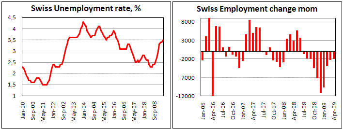Открыв «большой день» статистики рынка труда, Швейцария опубликовала данные по занятости за прошлый месяц. В целом данная статистика совпала с ожиданиями, отметив рост уровня безработицы в апреле до 3,5% с 3,4%. За месяц число безработных выросло немногим менее, чем на 2000 человек. Конечно, нельзя исключать сезонный фактор, хорошо заметный на графике, но при этом вновь бросается в глаза улучшение динамики на рынке труда. Очередной отчет из очередной страны говорит нам, что темпы спада мировой торговли и промышленного производства очевидно замедляются. Отовсюду звучат слова о том, что худший сценарий, на который ориентировались в начале года, не осуществляется. Это приводит к переоценке склонности к риску, что повышает спрос на заимствования в швейцарских франках. Робкое давление на chf, которое наблюдается с начала месяца, отметил глава SNB, очевидно ожидая улучшения за счет более привлекательных цен на произведенные товары в Швейцарии. Пока позитивные настроения на рынках сохраняются, франк, равно как иена, будет находиться под давлением. Тем не менее, S&P находится всего на 5 процентов ниже важного уровня сопротивления. От того смогут ли участники рынка сохранить настрой после 2-х месячного ралли, будет зависеть дальнейшая динамика торгов пары.