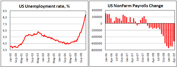 Рынок труда США потерял в апреле 539 тысяч рабочих мест, а уровень безработицы вырос с 8,5% до 8,9%, сообщило сегодня министерство труда США. Non-farm payrolls сократился меньше первоначальных ожиданий, которые составляли приблизительно 600 тысяч, а вот уровень безработицы вышел в соответствии со средней оценкой экономистов. Нужно отметить, что стресс-тесты проводились исходя из средней безработицы в 2009 году на отметке как раз в 8,9%, а на 2010 роста до 10,3%. Достижение таких показателей на конец 2009 года маловероятно, так как предполагает средний темп роста по 0,1 проц. пункта, начиная с июня, при том, что майская безработица не изменится. В очередной раз были пересмотрены с существенным ухудшением показатели занятости за предшествующие месяцы: теперь максимальное месячное падение приходилось на январь и составило 741 тысячу, позднее темп сокращения рынка труда замедлялся до 681тыс. в феврале, 699 в марте и текущих 539 на апрель. Накануне появилось множество прогнозов и оценок, что спад рынка труда прошел свой пик, и в скором времени будет происходить постепенное улучшение показателей. В исследованиях опираются также на показатели первичных обращений за пособием, по которому также отмечено снижение с максимальных уровней (но уже приходящихся на апрель). Нельзя отрицать, что замедление темпов спада является признаком стабилизации экономики. По крайней мере, публикации перестают пестреть пугать ускорением темпов спада, хотя накопленные цифры (по рынку труда, по рынку жилья и товаров длительного пользования) говорят, что восстановление будет длительным и постепенным, если не мучительным. В то же время все сосредоточились на изменении потенциала, а не абсолютных показателях. Для доллара разговоры о восстановлении экономики носят негативный характер, так как инвесторы предпочитают в благоприятные периоды вкладываться в более доходные бумаги, номинированные в «сырьевых» и азиатских валютах. На этом фоне спрос на американские государственные бумаги падает. Вчера за 30-летние казначейские облигации инвесторы требовали более высокой доходности. Ставка по UST-10 также продолжает расти, составив 3,323%, максимального уровня с конца ноября прошлого года. По всей видимости, Федеральному Резерву можно будет производить более активный выкуп казначейских облигаций. Вряд ли это хорошая новость для доллара.