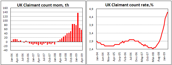 Сохраняя тон, заданный ноябрьской речью, Банк Англии в очередном выступлении главы наносит удар по фунту стерлингов. Сегодня Мервин Кинг представлял квартальный отчет по инфляции. Как отметили некоторые комментаторы, Банк «не купился на позитивные настроения, распространившиеся среди инвесторов и представителей власти». Прогноз английского ЦБ предполагает снижение темпов инфляции ниже целевого уровня в 2% в среднесрочной перспективе. А это означает, что власти намерены и далее расширять политику количественного смягчения, что несет в себе негативный сигнал для фунта. Комментируя решение BOE расширить программу по выкупу активов до 125 млрд. с 75, Кинг отметил, что снижение номинального спроса оказалось более значительным, чем ожидал центробанк. Судя по тому, что доходность государственный облигаций вновь выросла в последние недели, банку необходимо будет продолжать эту программу. В отчете говорится, о высокой вероятности дальнейшего ухудшения, а восстановление будет очень медленным. Отчет вызвал сразу массированные продажи стерлинга, контрастируя со вчерашними очень неплохими показателями. Вчера остался неосвещенным отчет рынка труда, показавший в апреле рост числа получающих пособие по безработице на 57,1 тысячу, при ожиданиях в 85 тыс. и 65,5 тыс. месяцем ранее, подняв этот показатель до 4,7%. Уровень безработицы, тем не менее, вырос сильнее ожиданий, составив 7,1% за последние три месяца.