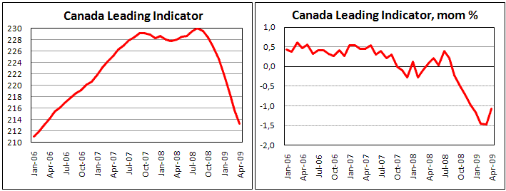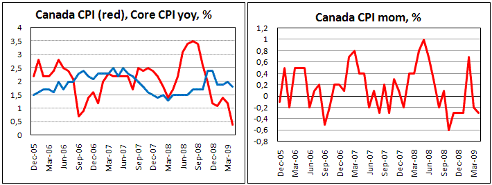 Потребительские цены в Канаде снизились в апреле на 0,3%, при этом годовой темп роста цен сократился до 0,4% с 1,2% месяцем ранее, сообщило сегодня официальное статистическое агентство страны. Экономисты ожидали более высоких темпов инфляции в свете роста цен на сырьевых площадках, начиная с февраля. Тем не менее, экономический спад не позволяет компаниям поднимать цены из боязни потерять клиентов. Также ослабляют реальные показатели инфляции и экономические ожидания. Эти индексы только сейчас, в мае, подтвердили восходящую тенденцию, а до этого как экономические, так и инфляционные прогнозы пересматривались от месяца к месяцу в сторону понижения. Темп роста стержневого индекса инфляции сократился до 1,8% с 1,9% месяцем ранее, что вызвано некоторым падением цен на коммунальные расходы и оплату аренды. Слабые показатели инфляции могут служить подспорьем потребителям, чья покупательная способность растет. Мы уже не раз отмечали, что по всему миру опросы показывают связь стабильных цен с более оптимистичными ожиданиями на будущее. Канада не стала исключением, а канадский доллар к тому же получает дополнительное преимущество от взлета на сырьевых рынках. Индекс опережающих индикаторов, этой страны, хотя и продолжает сокращаться, то при этом отмечается замедление темпов спада до 1,1% с 1,5% месяцем ранее, что также подтверждает оптимистичные прогнозы. При нефти, обновляющей максимумы с ноября и относительно размороженных кредитных рынках пара usd/cad провалилась до октябрьских уровней. Притяжение к 200-дневной скользящей средней не наблюдающееся по S&P500, нефти и eur/jpy движет канадскую валюту с двойной силой, нацеливая на 1,13 в паре с долларом США. Мы при этом рекомендуем сохранять осторожность при оценке более длительных перспектив, так как произошедший рост был слишком стремительным.