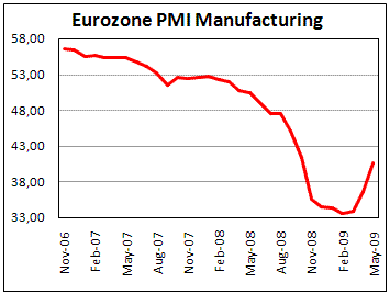 Европейский окончательный PMI за май был пересмотрен в сторону небольшого увеличения до 40,7 с 40,5 при 36,7 месяц назад. В целом публикация оказалась в рамках прогноза, поэтому не вызвала бурной реакции рынка, однако сумела выступить дополнительным фактором, поддержав укрепление евро. Нужно отметить, что промышленный PMI еврозоны в настоящий момент находится ниже показателей соответствующего индекса в Великобритании, что отражается в динамике курсов валют на сегодняшний день. Европейская промышленность стоит в несколько более стесненных условиях. Одной из главных причин является более мягкая кредитно-денежной политика (ставка в Великобритании 0,5% против 1,0% в еврозоне), а также нестандартных мер, которые гораздо смелее применяет Банк Англии. Все это несколько сдерживает кредитные рынки, а, следовательно, и производственный сектор. Кроме того, нельзя списывать со счетов и проведенный довольно удачный раунд снижения фунта, которое дало преимущества британским производителям. Единая валюта обновила сегодня локальный максимум к доллару, установив его на 1,4245, в то же время оказавшись под давление к фунту и демонстрируя умеренный прирост к иене. Однако, общий позитивный настрой рынков может увлечь евро к 1,44 в течение этой предположительно волатильной недели. В первую очередь нас ждет решение по ставке ЕЦБ и, что еще важней, комментарии от Трише. В последнее время рынок более нервозно воспринимает тон главы ЕЦБ, чем отчет рынка труда в США (non-farm payrolls). До этого момента вполне вероятно ожидать привязку колебаний евро к ценам на нефть (на ожидании восстановления спроса) и золото (на опасениях инфляции).