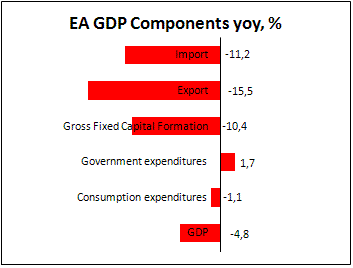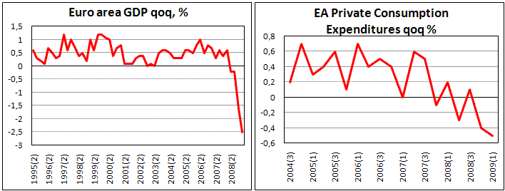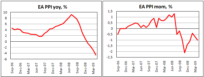 Уточненный релиз ВВП еврозоны подтвердил снижение экономики региона на 2,5% в первом квартале к четвертому кварталу прошлого года, но при этом были пересмотрены в сторону снижения предшествующие данные. Таким образом, к 08Q1 ВВП потерял 4,8%, а не 4,6%, как оценивалось ранее. Опубликованный отчет показал, что потребительские расходы сократились на 0,5% в первом квартале вслед за падением на 0,4% в предшествующие три месяца. Экспорт и импорт продемонстрировали наибольший отрицательный вклад, потеряв соответственно 8,1% и 7,2%. Наибольший отрицательный вклад в ВВП внесли изменения в запасах, они отняли процент и сокращение экспорта, оно убавило еще 3,2 (хотя импорт прибавил 2,9). Данные оказались несколько хуже ожиданий, хотя и обнажили никаких новых фактов, поэтому и снижение единой валюты вслед за публикацией оказалось кратковременным. Оказалась также в рамках прогнозов публикация индекса цен производителей. PPI потерял 1,0% в апреле, достигнув снижения в 4,6% к апрелю прошлого года. По-прежнему возглавляет снижение показатели в энергетике. Стоимость энергии упала в апреле дополнительно на 3,0%, остальные сектора также снижаются, хотя и не столь сильно.