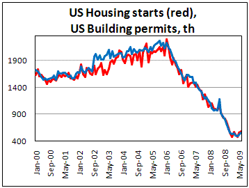 Число новых закладок домов неожиданно выросло в июне до 582 тыс. в годовом исчислении, увеличившись на 3,6% после прыжка на 17,3% месяцем ранее. Кроме того, в сторону повышения были пересмотрены данные за предшествующие три месяца. Еще более позитивным сигналом стало увеличение закладок односемейных домов в июне сразу на 14,4%. Этот показатель часто используется в качестве ориентира потребительских настроений и в уверенности в будущих доходах. И он говорит о положительных тенденциях. В то время как общий показатель демонстрирует сокращение числа новых строительств к июню прошлого года на 46%, одноюнитовые дома получают все больший спрос после обвала в начале месяца. Теперь падение год-к-году составляет 28,2%. Определенно, на рынке домашнего строительства США наблюдается разворот тенденции благодаря программам, проводимыми правительством и Федеральным Резервом. Однако, все больше внимания участников рынка переключается на показатели коммерческого строительства. Они могут не быть столь однозначно хороши, так как компании настроены на сокращение издержек. К сожалению, адекватную статистику по этим показателям достать сложно, до публикации ВВП. Отличная статистика по рынку первичного жилья вызвала пересмотр отношения к риску со стороны участников рынка. Доллар быстро вернул большую часть завоеванного в течение дня к основным валютам, а также нефти и золоту. Насколько подтвердятся эти признаки оживления в следующих месяцах на фоне уровня безработицы в 9,5%, остается только догадываться. Ну а по итогам недели евро/доллар может закрепиться выше 1,41, что откроет паре путь наверх, вопреки нашим прогнозам на снижение до 1,39.