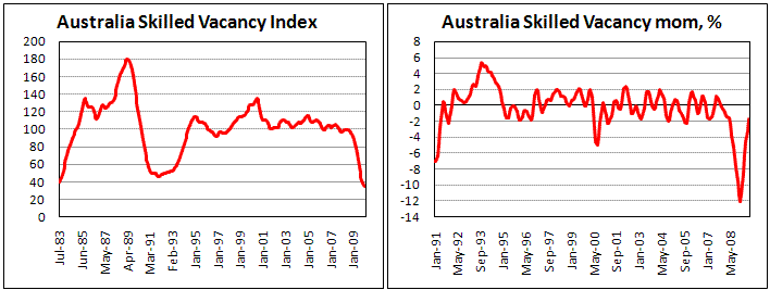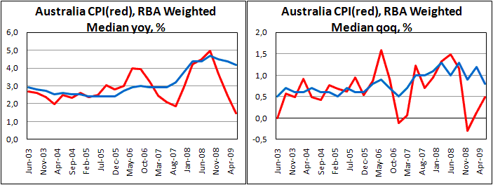 Индекс потребительских цен Австралии совпал с ожиданиями, повысившись за второй квартал на 0,5% после увеличения на 0,1% в первые три месяца текущего года. Годовой темп инфляции снизился до 1,5% с 2,5%, что также оказалось в рамках прогнозов. Инфляция очевидно замедляется, говоря о том, что меры по поддержанию экономики, в числе которых были снижения ставок и налоговые стимулы, не вызывают опасений по росту инфляции. Однако с другой стороны, отслеживаемый Резервным Банком Австралии взвешенный индекс цен остается на весьма высоком уровне, 4,2%, потеряв за квартал 0,2 процентных пункта. Сохраняется также его темпы прироста выше среднего и от квартала к кварталу. Эта тенденция с одной стороны в благополучные времена являлась бы отражением устойчивого спроса, а сейчас же заставляет задуматься, справятся ли потребители с такими темпами роста цен, если рынок труда продолжит и далее подавать негативные сигналы. Сегодня также обращает на себя внимание публикация отчета по вакансиям. Индекс продолжает снижаться, однако темпы резко замедлились. Тем не менее, показатель находится на минимальных уровнях за всю историю наблюдений, а его отрицательная динамика замедляется просто из-за невозможности далее сокращаться. Спрос квалифицированный труд упал ниже времен рецессии начала 90-х, хотя уровень безработицы остается на гораздо более низком уровне. Тогда она зашкаливала за 10%, сейчас же составляет 5,8%. Этот разрыв может быть быстро компенсирован, учитывая рост неполной и временной занятости, а также тех, кто отказался от поисков работы. Несмотря на довольно слабые фундаментальные основы рынка труда, австралийский доллар остается устойчивым в ходе торгов сегодня, благодаря росту спроса на высокодоходные активы, в число которых входят и номинированные в AUD. Поддерживают также и все те факторы, которые указывали вчера.