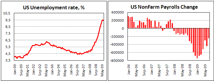 Число занятых в несельскохозяйственном секторе США сократилось в июле на 247 тысяч, заметно лучше прогнозов, обещавших в начале недели потерю экономикой порядка 320-330 тысяч. Затем, более сильные, чем ожидалось, данные по ADP, заставили пересмотреть в сторону повышения показатели до 275. Уровень безработицы при этом неожиданно снизился до 9,4% с 9,5%. При том, что ожидался его рост до 9,6%-9,7%. За последние три месяца экономика в среднем теряла по 331 тысячи, что почти вдвое ниже в сравнении с тем, что наблюдалось с ноября по апрель. После резкой спекулятивной продажи доллара на новости, затем последовала атака на евро. Крупные игроки продавили единую валюту вниз, но больше остальных пострадала иена. Она снижается уже более чем на полторы фигуры к доллару, отрабатывая техническую цель в районе 97, о которой мы упоминали вчера. Некоторые сразу же заговорили о том, что за укреплением доллара стоит рост оптимизма в отношении экономики США. На наш взгляд, здесь причины нужно искать в предстоящий на будущей неделе размещениях, под которые покупается доллар.