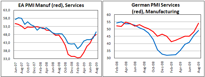Данные по индексу PMI для зоны евро вновь дали повод заговорить о том, насколько успешно Европа справляется с текущим кризисом. Лучше всех, как и было заявлено ранее в публикации ВВП, чувствует себя Германия и Франция. Общий PMI зоны евро оказался выше прогнозов и впервые более чем за год вышел с отрицательной территории. Его значение составило 50, что означает, что экономика не растет, но и не сокращается в августе. Производство замедлило темп сокращения, а соответствующий индекс вырос до 47,9 с 46,3. Сфера услуг показала гораздо больший прогресс, что отразилось ростом индекса до 49,5 с 45,7. Сфера услуг Германии и вовсе получила вторую жизнь, в то время как индекс PMI вырос до 16-месячного максимума в 54,1 пункт. Динамика в производстве все еще не пересекла ватерлинии в 50п., хотя движется по направлению к ней на полных парусах после провала в начале года. Во Франции, напротив, в зеленую зону выбилось производство, а сфера услуг все еще сокращается.