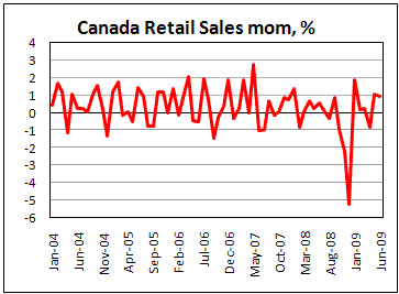 Рост розничных продаж в Канаде по итогам июня оказался далеко за пределами прогнозов, прибавив сразу 1,0% к прошлому месяцу, при ожиданиях +0,1%. Более того, данные за май были настолько же сильными (+1,1%), а увеличение продаж отмечено в течение 5 месяцев из последних шести. Сокращение продаж в сравнении с тем же месяцем прошлого года составляет 4,5% против -4,9% еще месяц назад. В сравнении со статистикой Штатов, где в июне сокращение год к году было вдвое больше, канадская говорит о довольно высокой потребительской активности в стране. Во многом это вызвано нормальным функционированием банковской системы, а также сырьевой направленности экономики. С февральских минимумов цены на нефть почти удвоились, достигнув сегодня максимума в 74,80.