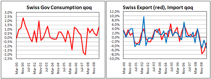 Валовой Внутренний продукт Швейцарии сократился во втором квартале на 0,3, сообщил сегодня SECO. Статистика оказалась лучше прогнозов, в то время как рынки оценивали падение в размере 1,0% после сокращения на 0,9% в первом квартале текущего года. ВВП снижается уже на протяжении года, за это время экономика сократилась на 2,0%. Хотя Швейцария не может похвастаться положительной динамикой прироста ВВП, как Германия, темпы сокращения ощутимо снизились, позволяя говорить о возможном росте по итогам текущего квартала. Наибольший положительный вклад внесли государственные (их доля 11% от ВВП, а рост составил 1,2%), а также потребительские расходы (у них соответственно, 60% и +0,6%) . Однако негативная динамика в мировой торговле и, как следствие, сокращение экспорта и падение инвестиций в производство оказали серьезное влияние на экономику в конечном итоге и обеспечив отрицательную динамику.