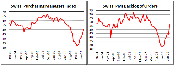 В то же время, нельзя не заметить и тех позитивных сигналов, которые демонстрирует экономика Швейцарии. Индекс PMI, рассчитываемый SVME, показал, что промышленность этой страны вернулась в фазу наращивания активности. Индикатор вырос в августе сразу до 50,2 с 44,3, серьезно обогнав прогнозы. Головокружительный рост продемонстрировала компонента Заказов (+12,4 п.), хотя неплохо улучшились позиции индекса по Выпуску и Ценам покупки (оба прибавили почти по 6 пунктов). Вообще же прирост наблюдался во всех компонентах, хотя такие показатели как Занятость, Запасы сырья и Готовой продукции все еще находятся в отрицательной зоне.