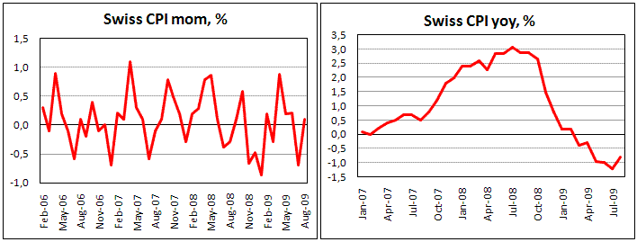 Индекс потребительских цен Швейцарии вырос в августе на 0,1%, сообщил сегодня SECO. При этом годовой темп снижения сократился с -1,2% до -0,8%. Хотя фактические данные оказались ниже прогнозов (0,2% м/м и -0,7% г/г), тем не менее, отражают некоторое снижение дефляционного давления в стране. За последние полгода цены росли в последние четыре месяца, хотя падение в июле и было существенным. Годом ранее отрицательная динамика сырьевых рынков уже с июля, то есть без задержек, привела к падению цен на потребительские товары и услуги. В настоящий момент цены на сырьевые активы являются также достаточно надежным индикатором для определения индекса CPI.