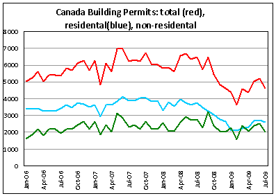 Число одобренных разрешений на начало строительства в Канаде неожиданно резко упало в июле. Как сообщила сегодня Statcan, показатель сократился на 11,4% к прошлому месяцу. Причем падение обусловлено в первую очередь резким снижением заказов в коммерческом секторе. Хотя он и отличается высокой волатильностью, но все же потерял в июле 19,3%. Жилищное строительство находится по масштабам заказов выше минимальных уровней этого года, но также снизилось, на 4,1 процента. Ситуация довольно типичная для многих стран. Потребительский интерес к новому жилью был подогрет упавшими ценами и многочисленными программами по поддержанию кредитования, равно как и снижением процентных ставок. Запустить инвестиции в бизнес-среде не так-то просто, когда компании ожидают довольно вялый потребительский спрос, но и при этом уже нагружены долгами, стараясь сократить расходы.