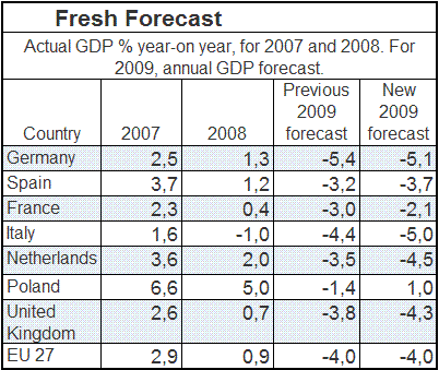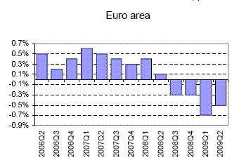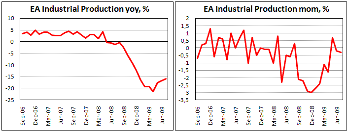 Кроме статистики рынка труда, были опубликованы и свежие данные по уровню промышленного производства. Оно сократилось в июле на 0,3%. В сравнении с прошлым годом падение составляет 15,9%. Годовой тренд изменил направление в сторону роста. При этом один за другим экономисты начали пересматривать прогнозы на остаток года. Немецкий институт IMK сказал, что ожидает роста ВВП на 0,5% в 2010г (ранее прогнозировалось падение на 0,4%). Оценка спада по итогам 2009г. также улучшена до -5,2% с -6,5%. Представитель Европейской Комиссии сегодня выступил с заявлением о том, что по итогам августа экономика Евросоюза вернулась к росту. Wall Street Journal опубликовал сравнение текущего прогноза с предшествующим, где видно значительное улучшение прогноза по Германии и Франции, а вот по Великобритании, Италии, Нидерландам прогноз был ухудшен.