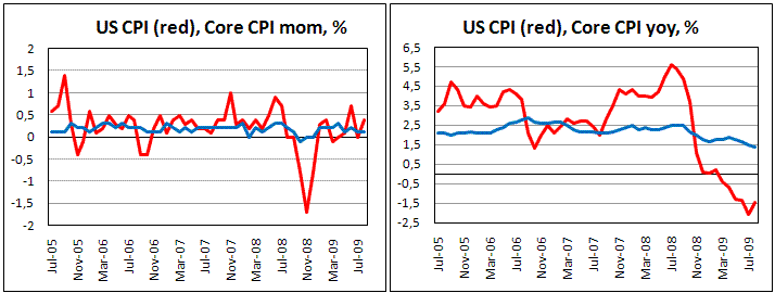 Индекс потребительских цен США вырос на 0,4% в августе, что совпало с обновленными прогнозами, полученными после довольно сильных показателей цен производителей, а также розничных продаж, опубликованных вчера. Годовой темп снижения цен составил 1,5% против 2,1% месяцем ранее. Как и ожидалось, стабильные цены на сырье и энергию в летние месяцы этого года противопоставляются падению годом ранее, что приводит к исправлению динамики цен. Однако, наблюдающееся восстановление цен на нефть наравне с различными программами правительства подстегивает инфляцию, равно как и улучшение настроений на рынках поддерживает инфляционные ожидания.