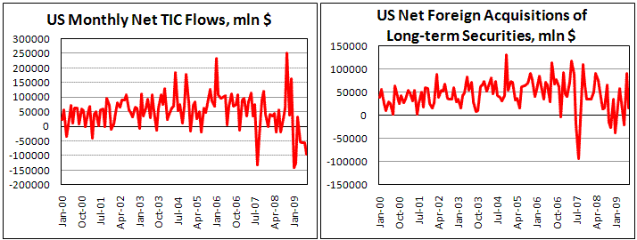 Казначейство США опубликовало данные по покупкам ценных бумаг со стороны инвесторов. В июле отмечается отток инвестиционных капиталов в размере 97,5 млрд., причем он сохраняется четвертый месяц подряд и носит впечатляющие размеры. В то же время основные держатели гособлигаций США, Китай и Япония, продолжают наращивать свои позиции в них, из-за некоторого восстановления международной торговли (по сути, они изымают доллары, вырученные за продажу товаров в США). Чистые покупки долгосрочных ценных бумаг составили 15,3 млрд. против 90,2 месяцем ранее. За год мир нарастил свои позиции в ценных бумагах Казначейства на 800 млрд. долларов. Это происходит отчасти также и вследствие большего их предложения для финансирования дефицита США. Однако, на межбанковском рынке долларов не становится меньше, что отражается в рекордно низких ставках LIBOR. Казначейство при этом сокращает свои аппетиты, чтобы не доводить соотношение долга к ВВП до критических уровней. Обама обращался к Конгрессу, чтобы законодатели разрешили поднять разрешенный лимит с 12,1 трлн., который, по прогнозам, будет достигнут в середине октября. Американский доллар достиг сегодня в ходе европейской сессии годового минимума и может торговаться и далее с понижением из-за уменьшившегося предложения гособлигаций, возросших ожиданиях по инфляции и улучшившихся прогнозах по мировой экономике.