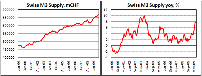 Темп роста денежной массы в Швейцарии остался практически без изменений в августе, несмотря на сохраняющуюся исключительно мягкую кредитно-денежную политику, проводимую SNB. Прирост денежного агрегата M3 в августе составил 7,7% г/г, застопорившись после резкого ускорения в предшествующие месяцы. Такой высокий темп роста предложения денег, однако, несет потенциальную угрозу для инфляции. Направленные в банковскую систему деньги в конечном итоге могут вылиться в чрезмерную доступность кредитования для населения, что несет в себе угрозу образования пузыря на рынке жилья, а также может стать причиной создания пузыря на рынке сырьевых товаров, если доступные денежные средства будут вкладываться финансовыми институтами в покупку защитных от инфляции нефти и золота.