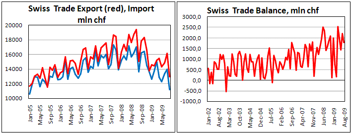 Торговля Швейцарии с внешним миром заметно сократилась в августе. Как сообщается на официальном сайте статистики, в августе экспорт упал почти на 20%, равно как и импорт. Положительное сальдо торговли сократилось до 1,79 млрд. против 2,2 млрд. месяцем ранее. Сравнение накопленных данных с начала года говорит о падении экспорта на 16,8% в реальном выражении, в то время как импорт продемонстрировал большую устойчивость, потеряв лишь 11,3%. Во многом такая статистика вызвана тем самым укреплением франка, которого так боялся допустить Национальный Банк в первом полугодии. Последние комментарии на эту тему в ходе прошедшего заседания не были столь решительными, как ранее, благодаря развернувшемуся тренду мировой экономики.