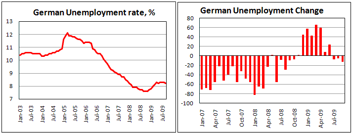 Данные по рынку труда Германии, публикуемые Бундесбанком, оказались неожиданно сильными по итогам сентября. Как сообщается, за текущий месяц безработица сократилась на 12 тыс., а ее уровень – упал с 8,3% до 8,2%. Рынок труда оказался более устойчивым, нежели предполагалось экономистами. Их усредненный прогноз говорил об ожиданиях роста числа безработных на 20 тысяч. Тем не менее, позитивные настроения, которые в значительной степени отражены в индексах от IFO, GfK и ZEW, оказали свое воздействие, поддержав ожидания роста спроса в стране за ее пределами.