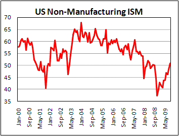 Индекс активности в непроизводственном секторе США вырос в сентябре до 50,9, что означает рост активности в сфере услуг, что не наблюдалось с сентября прошлого года. При этом рынки ожидали менее резкого роста с 48,4 до 50,0. Такой прирост объясняется в основном увеличением числа новых заказов, как фактических, так и тех, что пока еще в стадии договоренности. В расчете на восстановление спроса несколько нарастили запасы и оптовые склады, что также позитивно повлияло на общую динамику. А вот ценовое давление отказывается усиливаться, соответствующий индикатор провалился сразу на 14,3 пункта с 63,1 до 48,8.