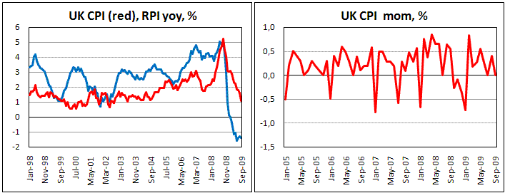 В подтверждение низкого инфляционного давления сегодня была опубликована довольно слабая статистика по инфляции в стране. Как сообщил ONS, индекс потребительских цен незначительно вырос в сентябре, замедлив прирост к прошлому году до 1,1% с 1,6%. При этом ожидалось увеличение по итогам сентября на 0,3% против фактических 0,0%. Розничные цены показали больший прирост месяц-к-месяцу, но в сравнении с уровнем прошлого года так и остаются на 1,4% ниже. Стержневая инфляция замедляется не столь значительно, опустившись лишь к 1,7% с 1,8%.