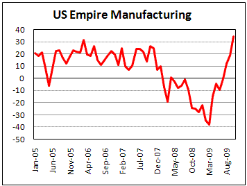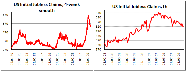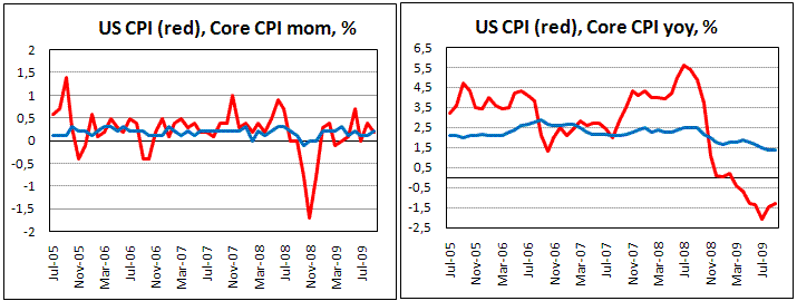 Индекс потребительских цен в США вырос сильнее ожиданий, прибавив в сентябре 0,2% при ожиданиях +0,1%, а годовое снижение замедлилось до 1,3% с 1,5% в августе. Наибольший прирост отмечается в энергетических товарах, которые прибавили 0,6%. Стоимость продуктов питания, напротив, несколько сократилась, на 0,1%. Стержневой показатель прибавил 0,2%, а его прирост год к году составил 1,5%. Все еще оставаясь на довольно низком уровне, который позволяет ФРС сохранять стимулирующую кредитно-денежную политику. Хотя некоторые плоды такой политики уже проступают. Индекс Empire Manufacturing вырос в октябре до 34,57 с 18,88, при том, что рынком предполагалось легкое снижение. Тем не менее, падающий доллар, вероятно, делает свое дело. Кроме Empire демонстрирует улучшение и динамика новых обращений за пособием по безработице. На прошлой неделе таких было 514 тысяч против 524 неделей ранее, свежие данные оказались лучшими с начала января, а сглаженный индекс продолжил снижение, равно как и накопленное число заявок на получение пособий по безработице. Оно опустилось ниже 6 млн., пусть и незначительно.